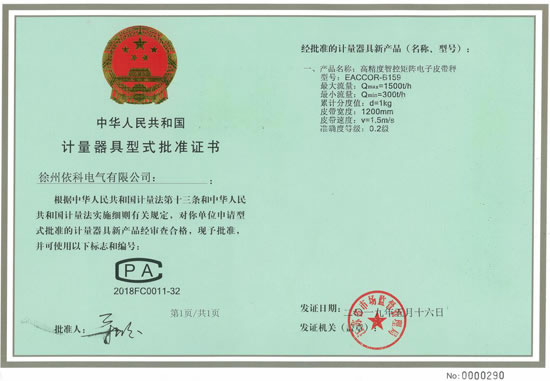 熱烈祝賀徐州依科電氣有限公司專利技術(shù)高精度智控矩陣電子皮帶秤EACCOR-B159獲得0國(guó)家0.2級(jí)計(jì)量證書CPA2018FC0011-32批準(zhǔn)證書,配套高精度矩陣傳感器及矩陣智能稱重控制器(采用SEQ-AI智能算法,矩陣控制跟蹤復(fù)核技術(shù),...